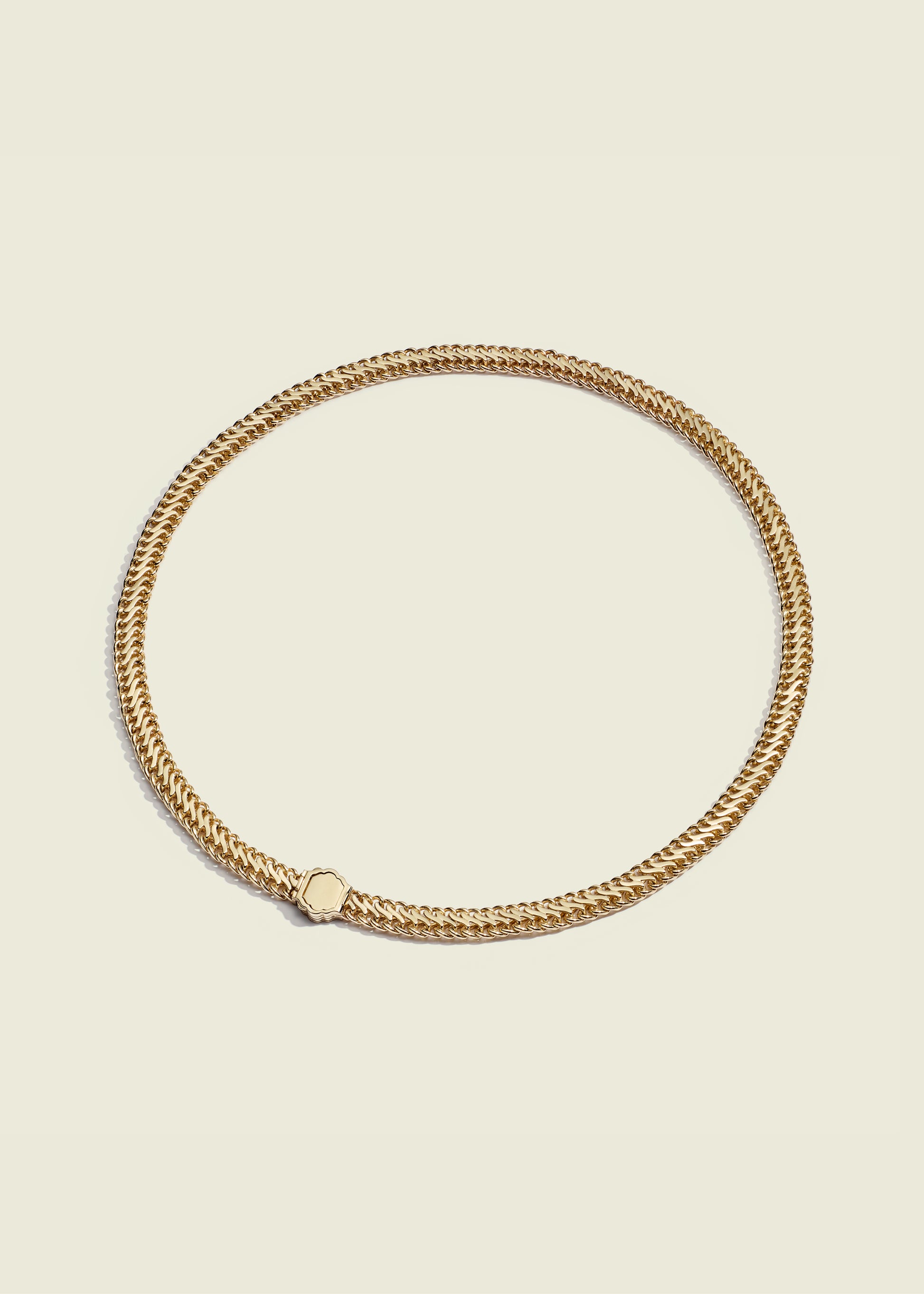Defined by a dramatic S-link chain, the links mimic that of a weaving snake, intertwining seamlessly into one another. Handmade in 14kt yellow gold, the Snakelet is secured with a clasp hidden within the elegant frame detail.