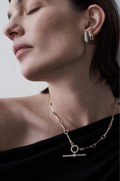 The Moonshine is a 14kt yellow gold crescent moon pendant with Victorian-set diamond pavé running along two facets. The pavé is offset by an antique finish while the pendant is suspended from a spinning pocket watch-style bail.