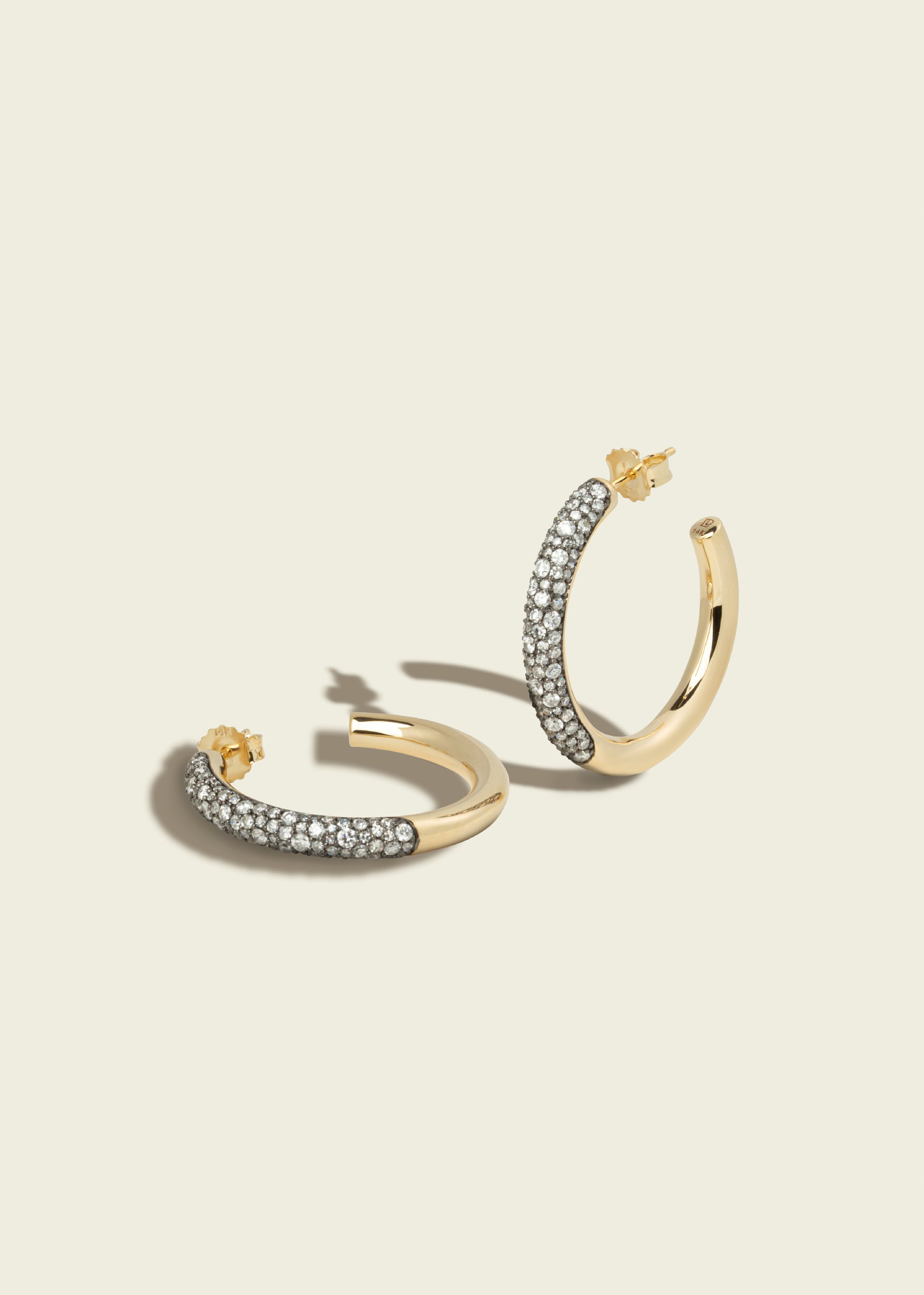 Victorian-set diamond pavé with antique finish, these dramatic hoop earrings feature a half hoop of diamonds complimented by polished 14kt gold. Hollow inside they are light and therefore easy to wear.