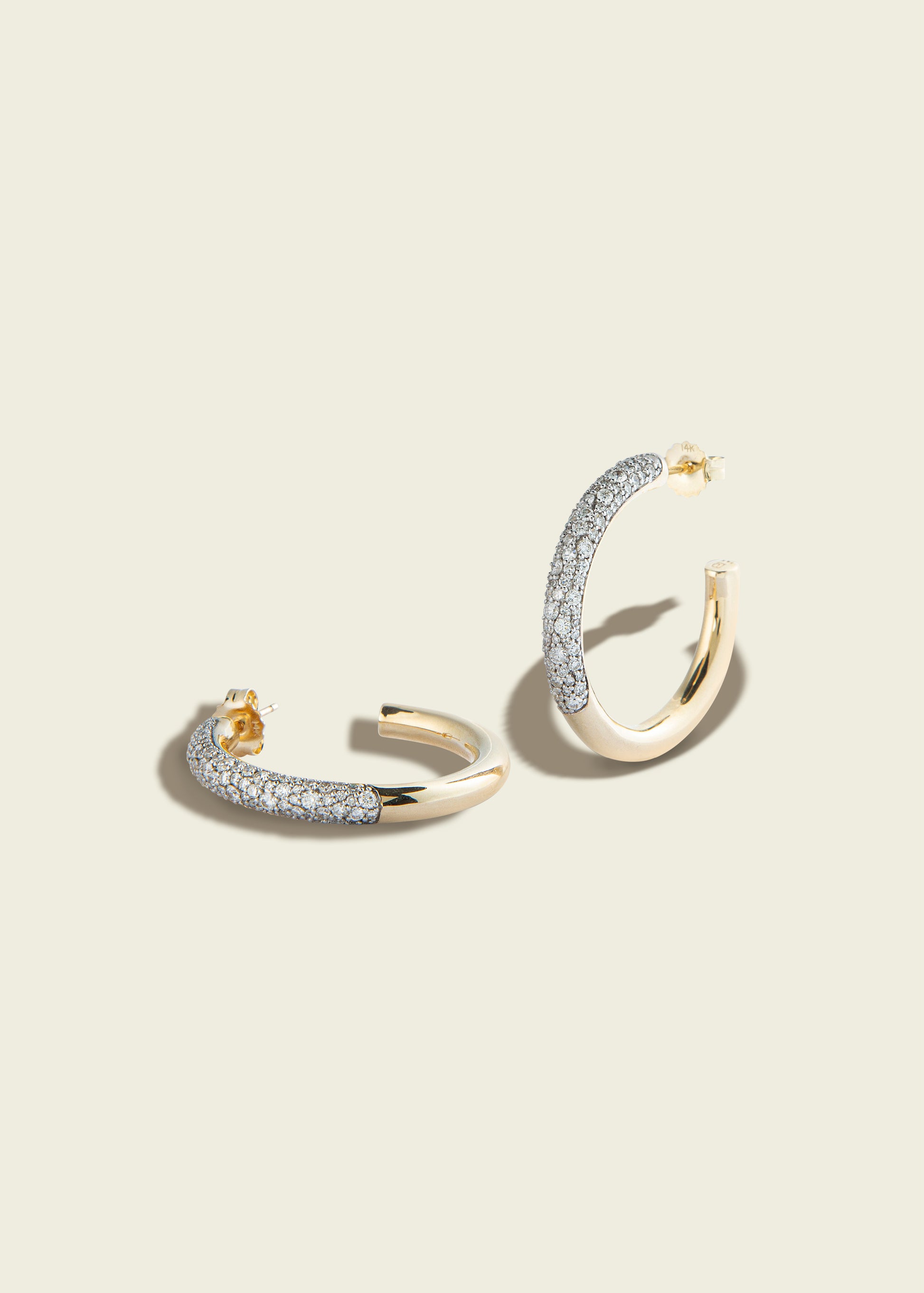 Victorian-set diamond pavé with modern finish, these dramatic hoop earrings feature a crust of diamonds complimented by polished 14kt gold. Hollow inside they are light and therefore easy to wear.