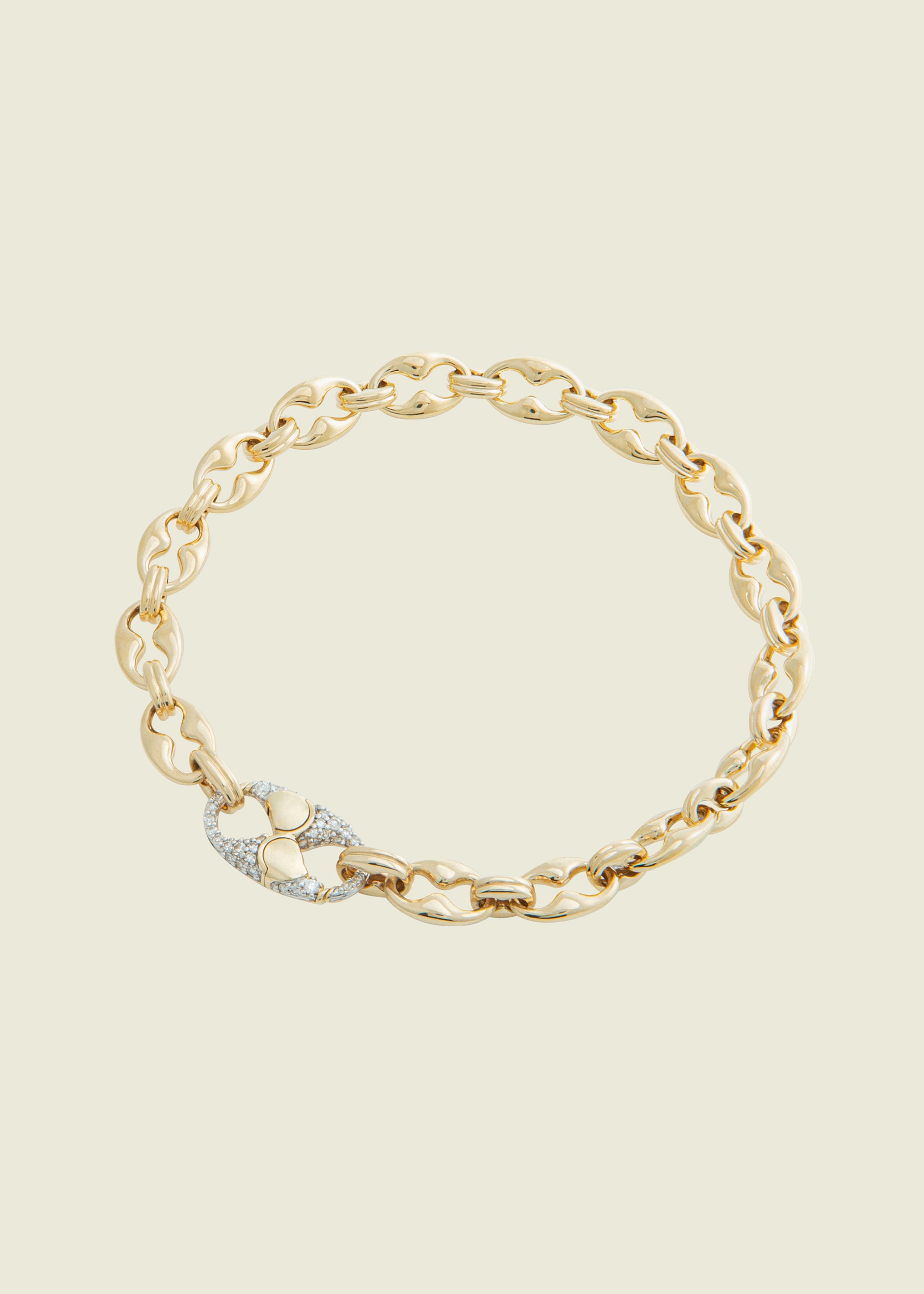 The little sister of the Persephone bracelet, this 14kt yellow gold Mariner-style chain bracelet with billowed links has a Victorian-set diamond pavé double-ended spring clasp.