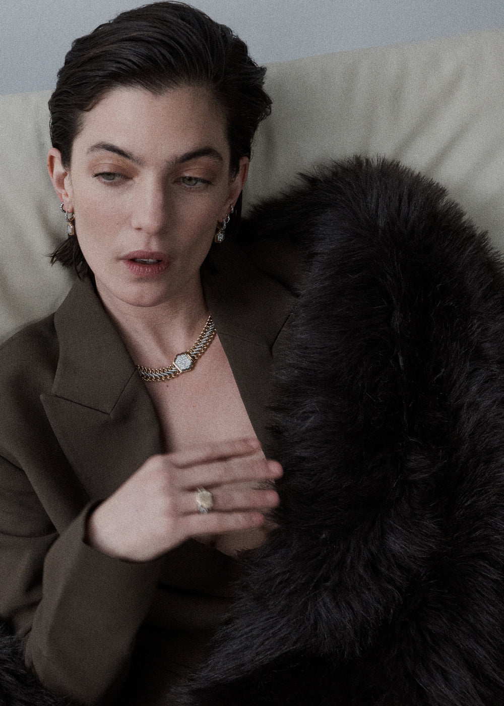 A bold and elegant S-link chain necklace cast in 14kt recycled yellow gold and amplified by a Victorian-set diamond pavé clasp. The curve of the links is designed to mimic the movement of Medusa’s serpent hair, with each one weaving seamlessly into the next. The Double Diamond Medusa is further elevated by diamond pavé set into the centre of each link.