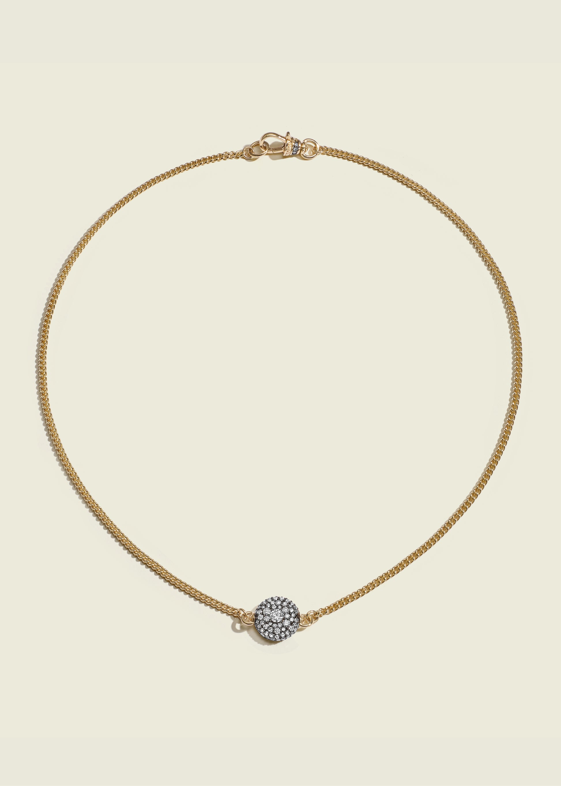 14 karat yellow gold Victorian-set diamond pavé baby pocket watch necklace in an antique-finish with curb chain and satin back for engraving.