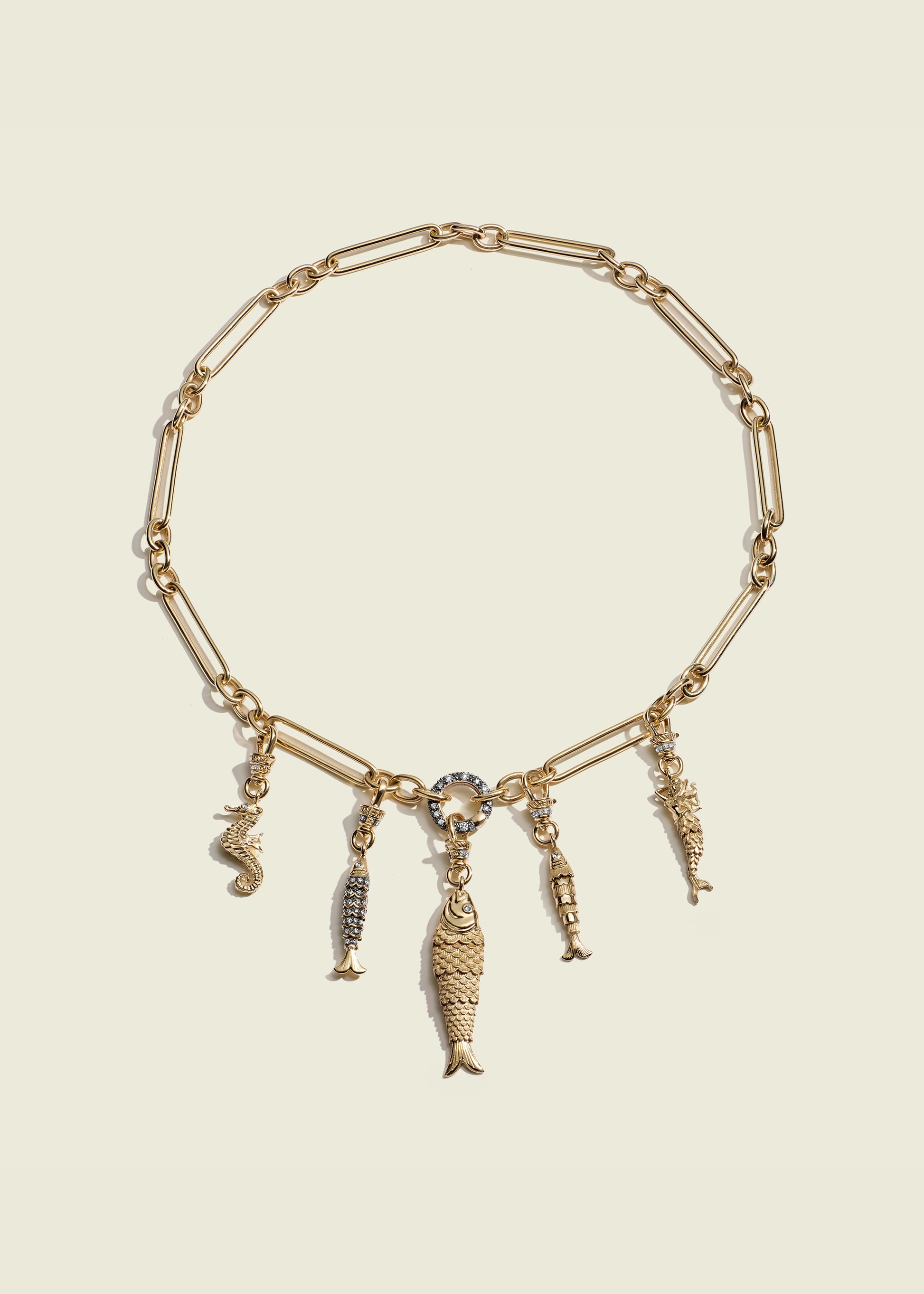Articulated and hanging from an Albert clip, the pot-bellied seahorse is a curved, textured pendant with diamond eyes. An old-school style with a hint of the kitsch, these pieces combine the lure of the sea, sailors and salty days with the elegance of Victorian jewellery.