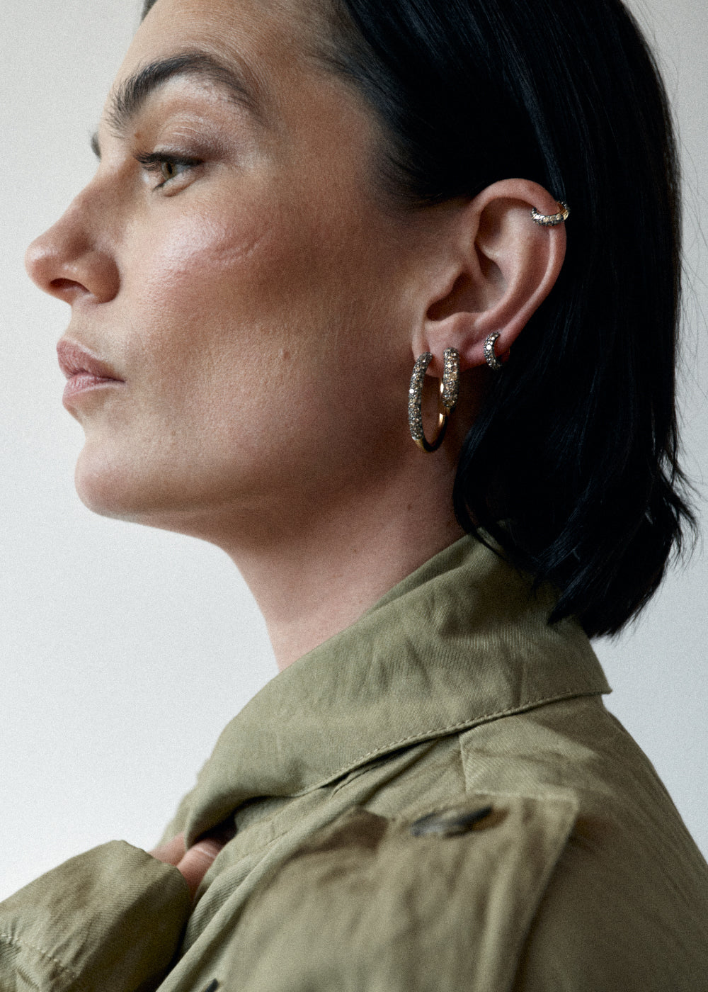 A pair of 14kt yellow gold Chubby Huggies featuring diamonds on both the front and back of the hoop. The Victorian-set pavé has a modern finish. Wearable everyday and complimented when stacked with other hoops.