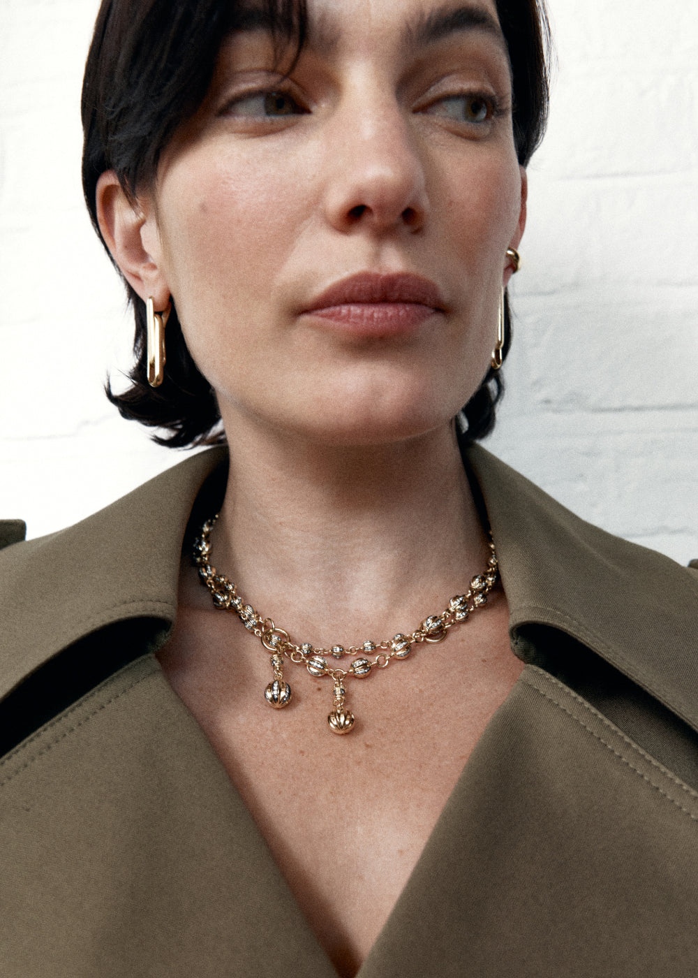 A 14kt yellow gold orb, the Ball Breaker pendant has Victorian-set diamond pavé within the fluted detailing. Hung from an Albert clip and spnning bale with further pavé and an antique finish.