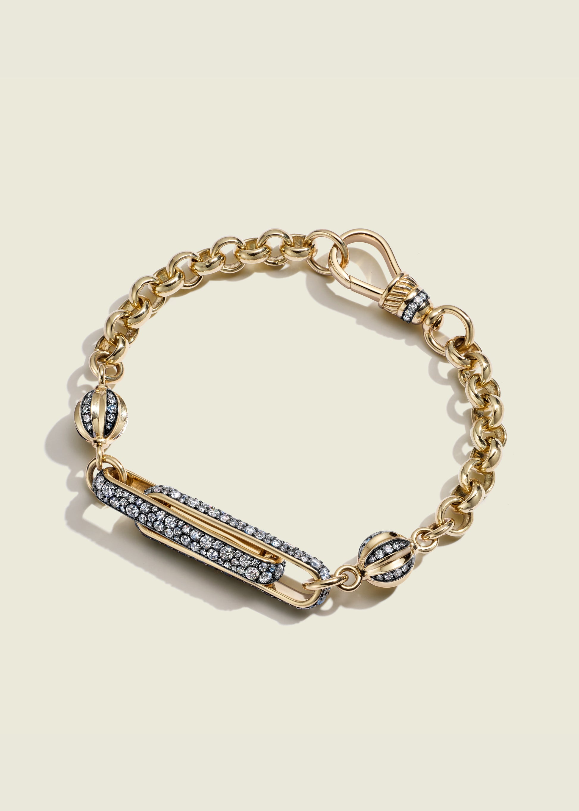 14kt yellow gold belcher chain bracelet with a central, interlinked trombone, topped and tailed with a fluted ball. Both the trombone link and the orbs have Victorian-set diamond pavé with an antique finish. The bracelet is secured with an Albert clip with further diamonds.