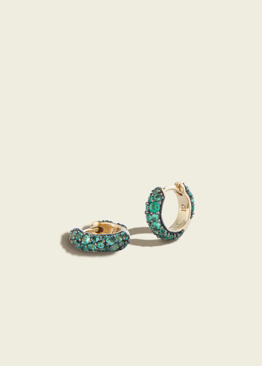 A pair of 14kt yellow gold Chubby Huggies featuring emeralds on both the front and back of the hoop. The Victorian-set pavé has an antique finish. Wearable everyday and perfect when stacked with other hoops.