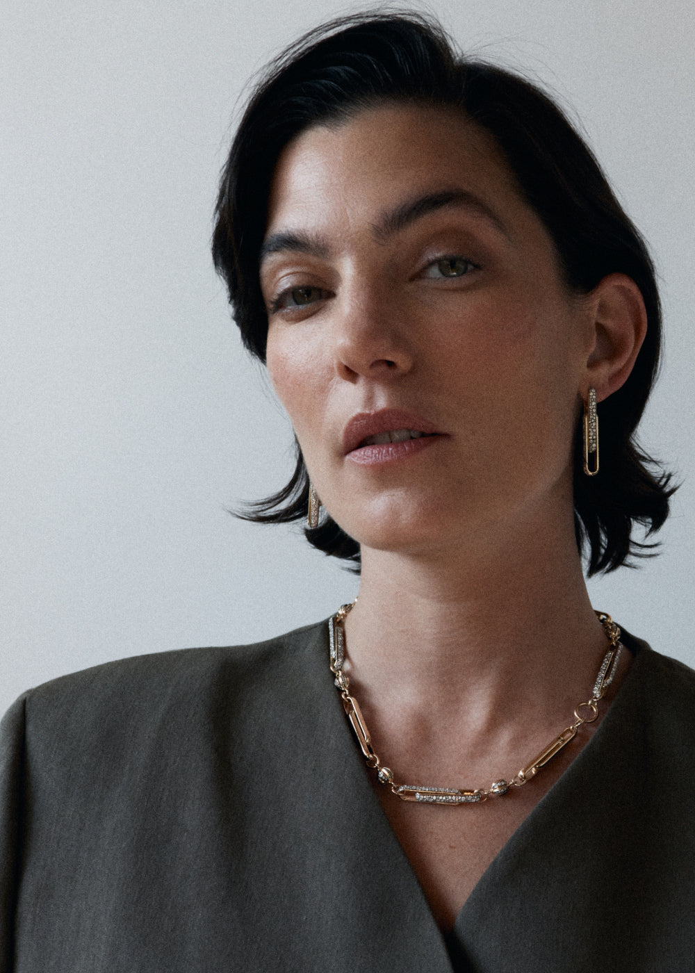 Another example of Lucy’s love of playing with scale and form, the Diamond Switch Stirrup is an oversized, exaggerated chain inspired by a vintage orb and link necklace. Alternating 14kt polished gold and Victorian-set diamond pavé links joined by riveted diamond orbs, the chain is secured with a spring-hinged clasp.