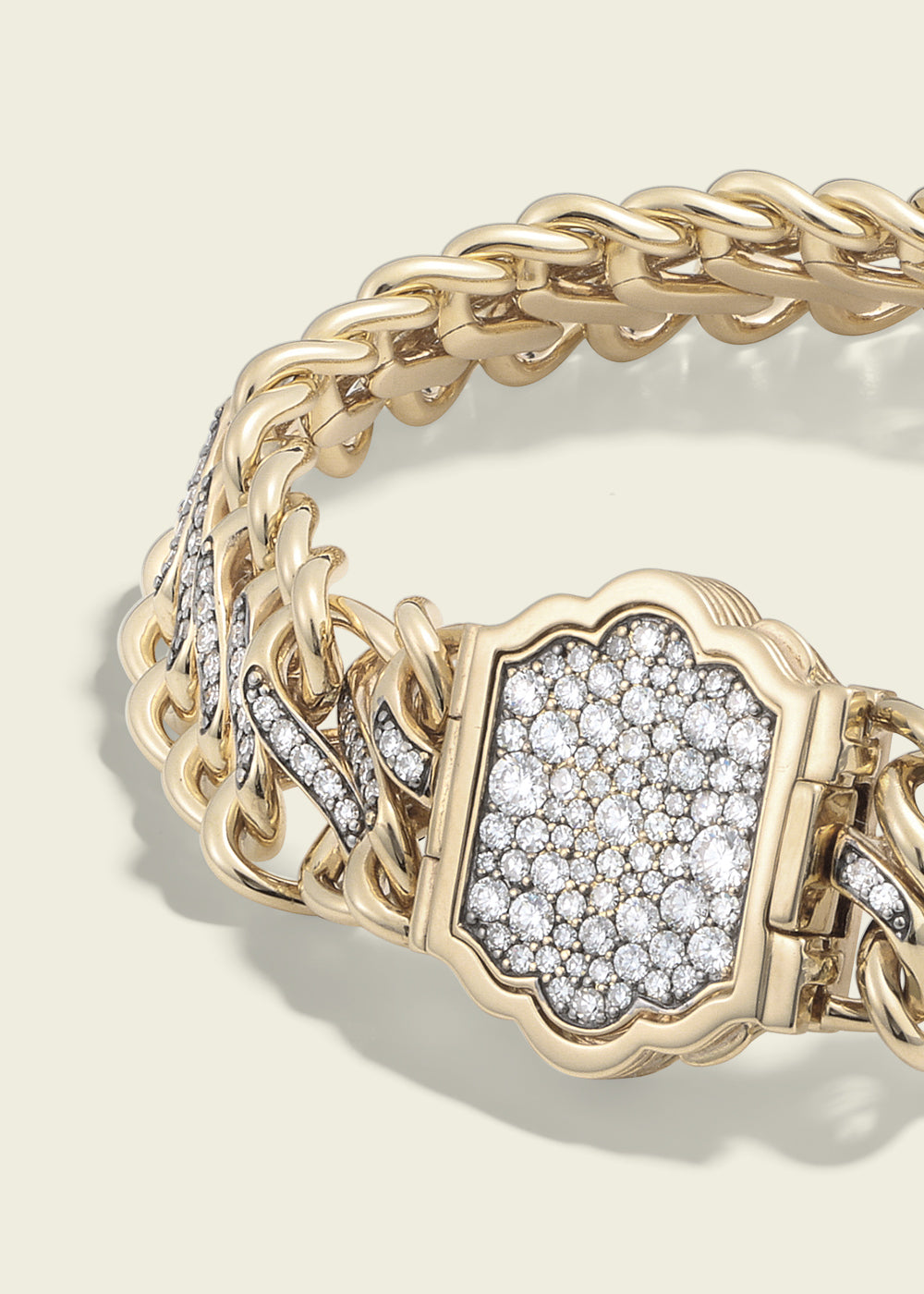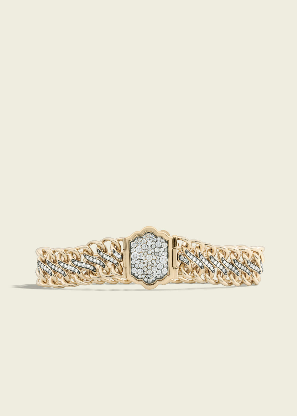 A bold and elegant S-link chain bracelet cast in 14kt recycled yellow gold and amplified by a Victorian-set diamond pavé clasp. The curve of the links is designed to mimic the movement of Medusa’s serpent hair, with each one weaving seamlessly into the next. The Double Diamond Medusa is further elevated by diamond pavé set into the centre of each link.