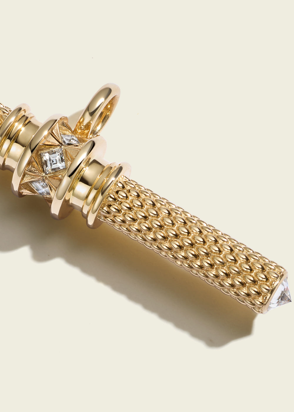 A design based on the vintage lighters of the 40s and 50s, the Buchanan T-bar has a fluted texture with carré-cut diamonds set into the central cuff. A larger pendant than our classic T-bar. it is made in 14kt yellow gold and has reverse-set brilliant-cut diamonds at either end.