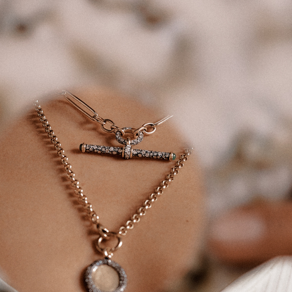The Victorian-set diamond pavé connector link with modern finish. Crafted in 14kt yellow gold with a spring hinge, the Connection is designed to be worn with our chains and completed with a pendant.