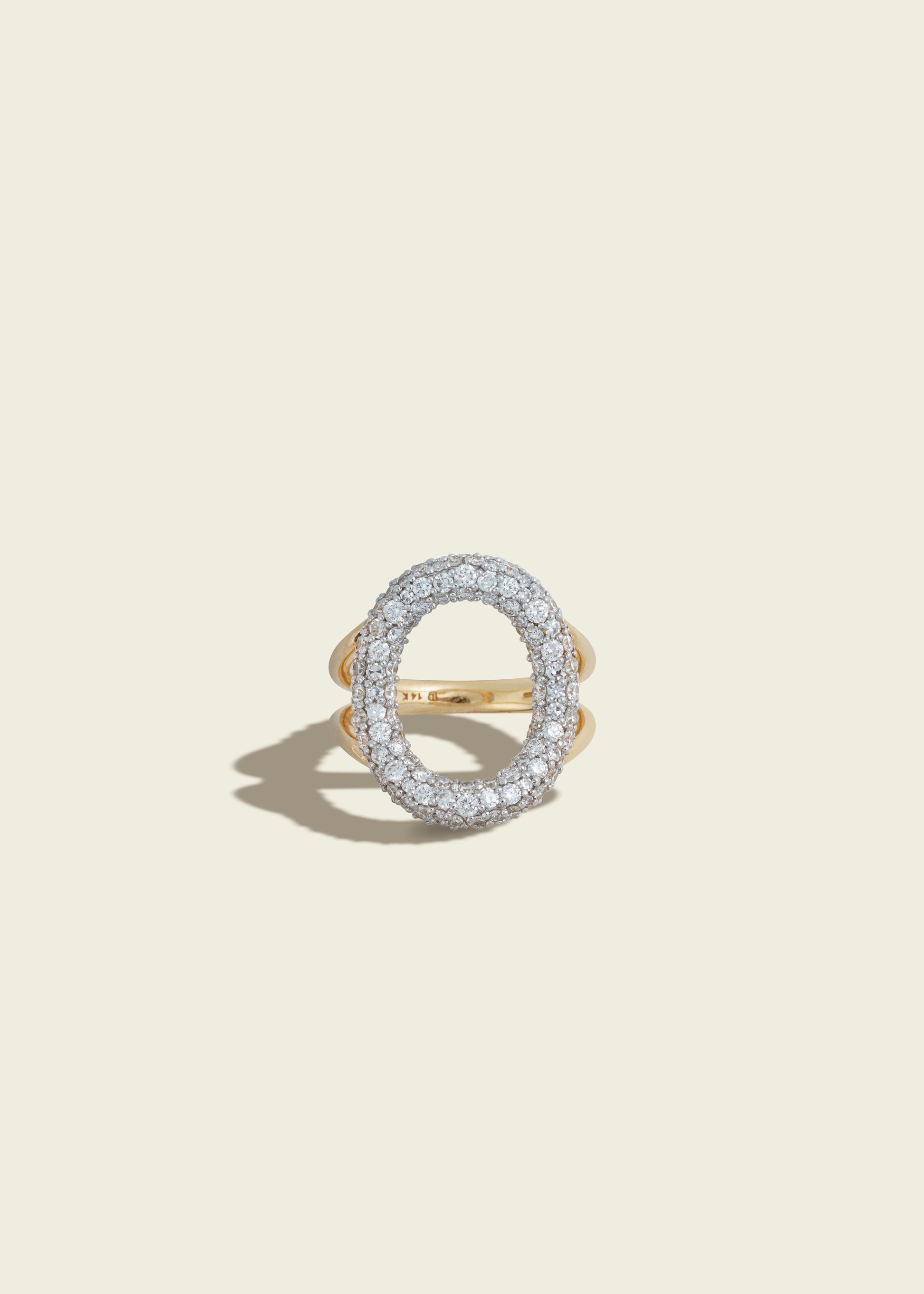 Victorian-set diamond pavé on an oval ring. Made of 14kt yellow gold, the inside of the ring has an intentionally rounded shape allowing for a smooth and comfortable fit.