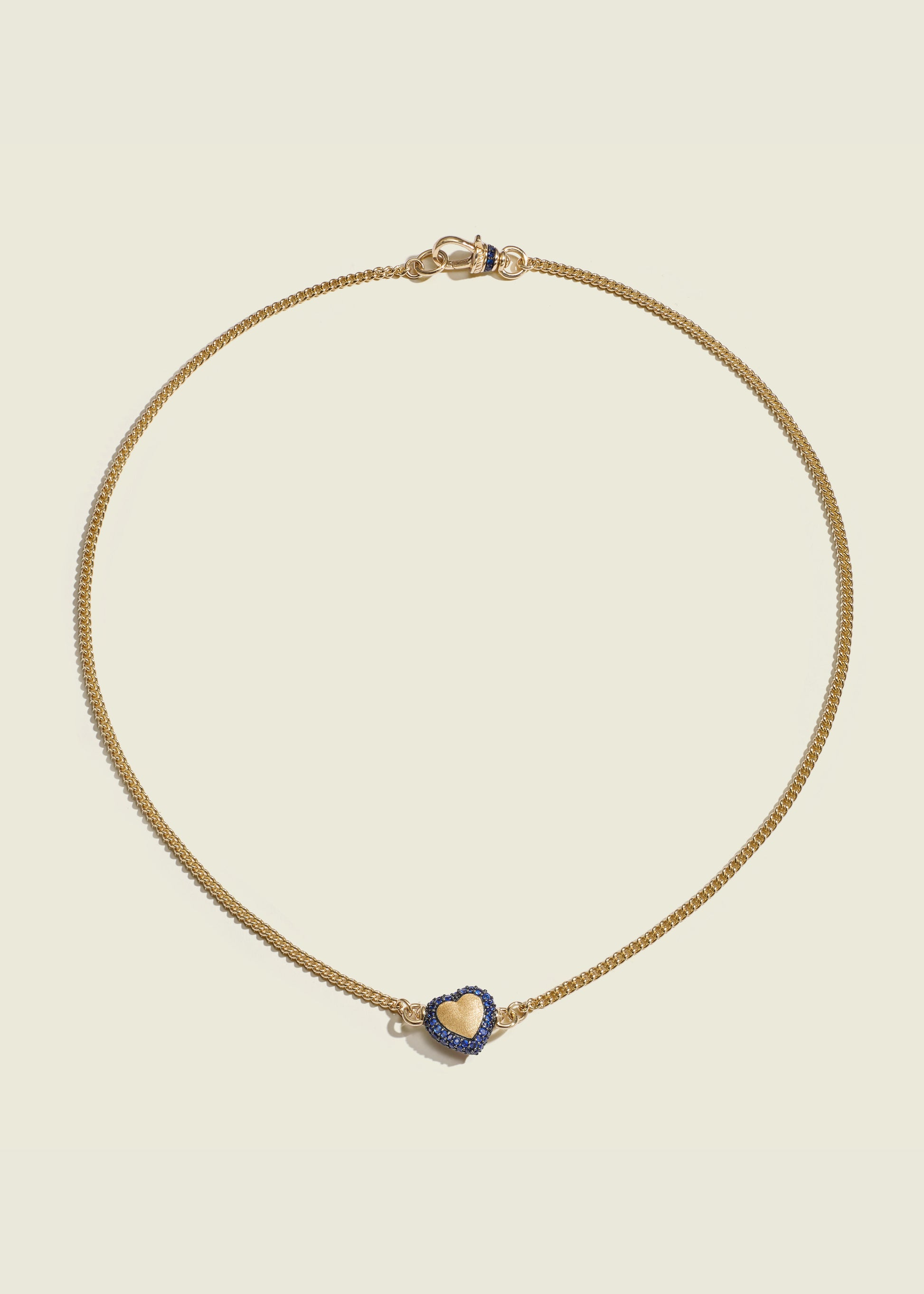 A Victorian-set sapphire pavé tilted heart necklace with central heart-shaped sapphire. Suspended from a curb link chain and crafted in 14kt yellow gold, the pendant spins to reveal the satin-polish reverse.