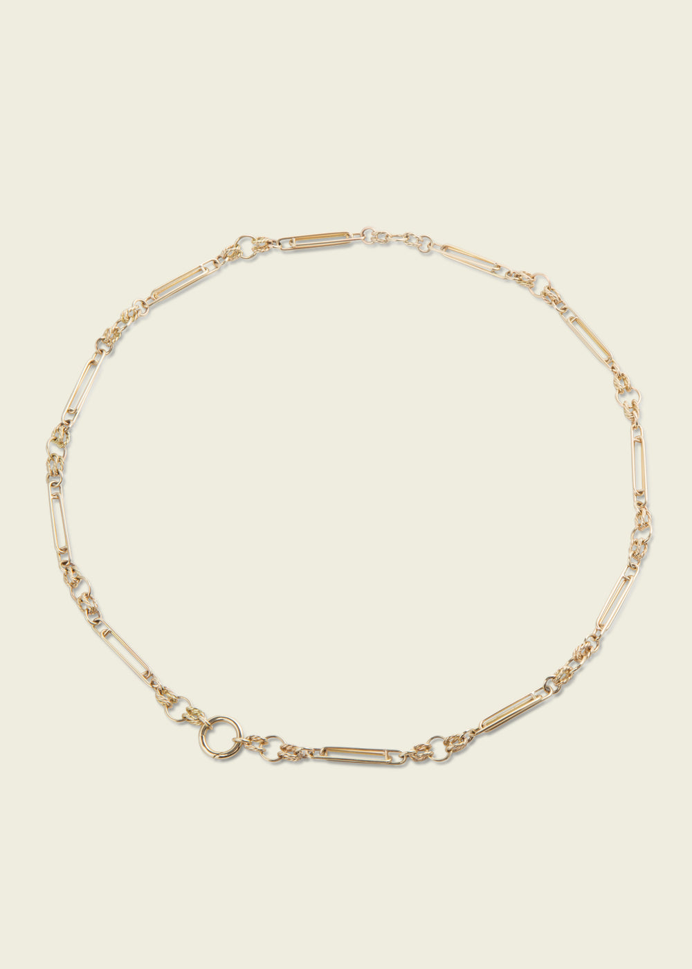 This twisted link chain has a spring hinged clasp that is designed to be worn either to the front or the back. Crafted from 14kt yellow gold, the necklace’s silhouette is rooted in the Victorian pocket watch chain.